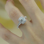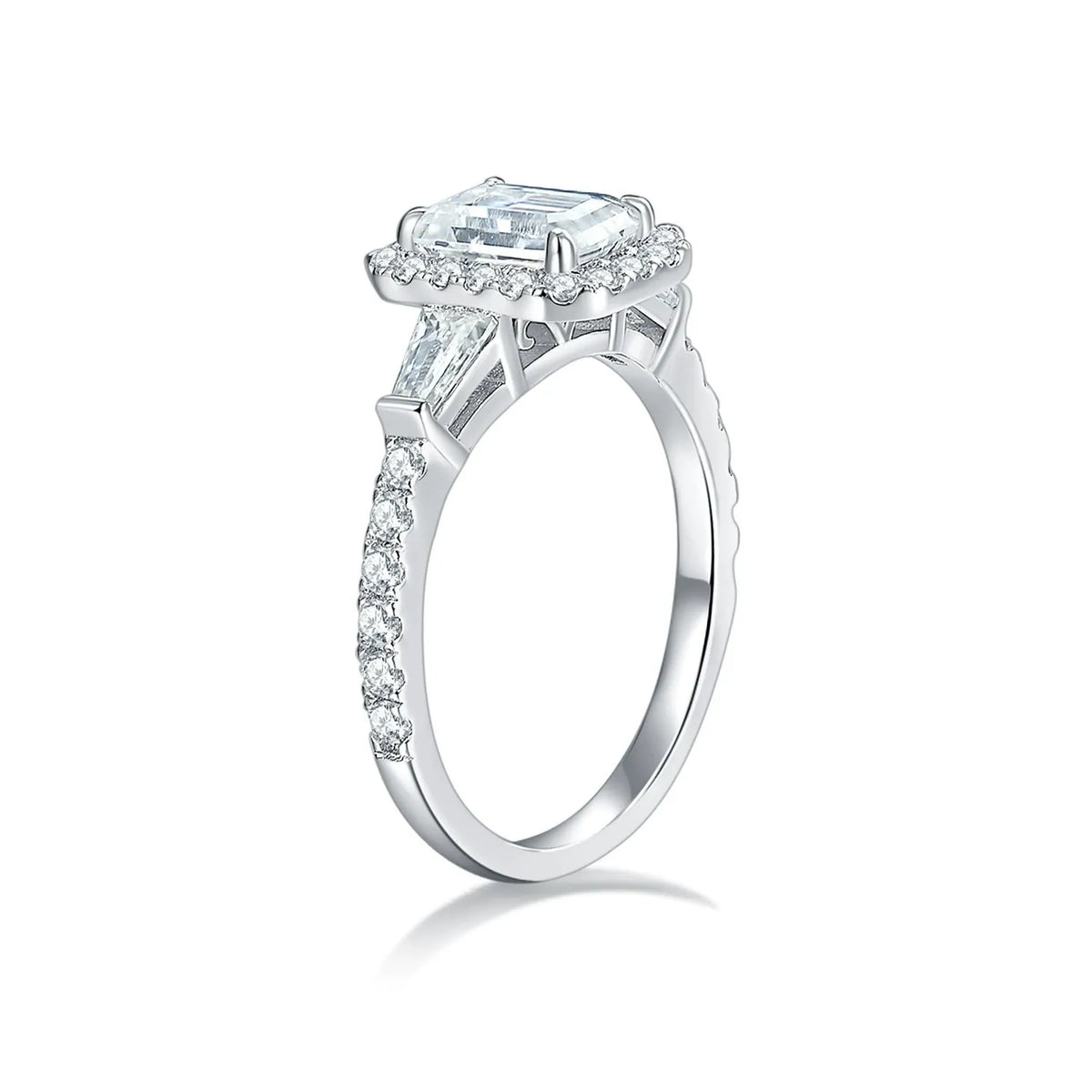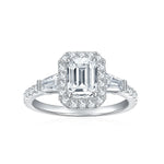Emerald Halo Tapered Baguette Side Stones Pavé Band Moissanite Engagement Ring